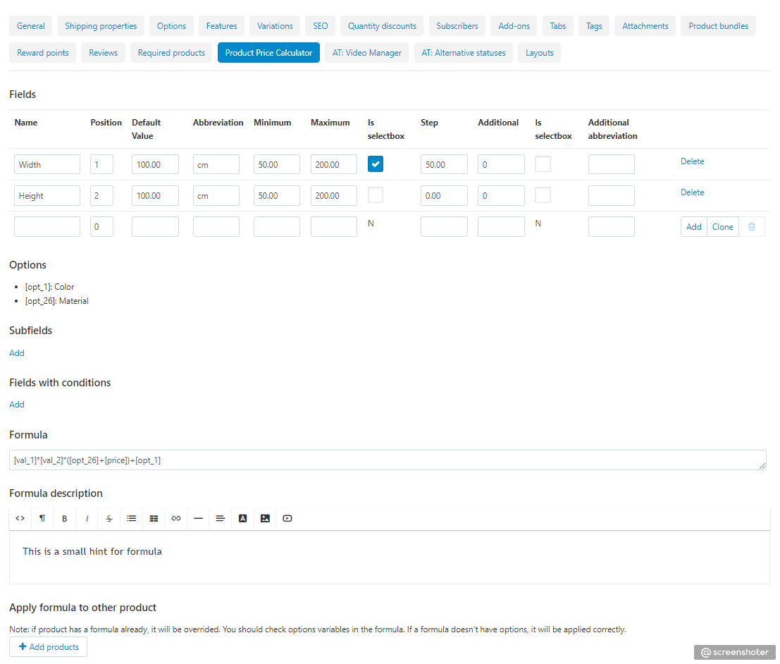 **Please note!** Only a formula without options will be applied correctly. If a formula has options and you applied this formula to other products, please check and change the options id values in the formula or remove them if they are not necessary. Also, if you apply a formula to a product that already has a formula, it will be rewritten.